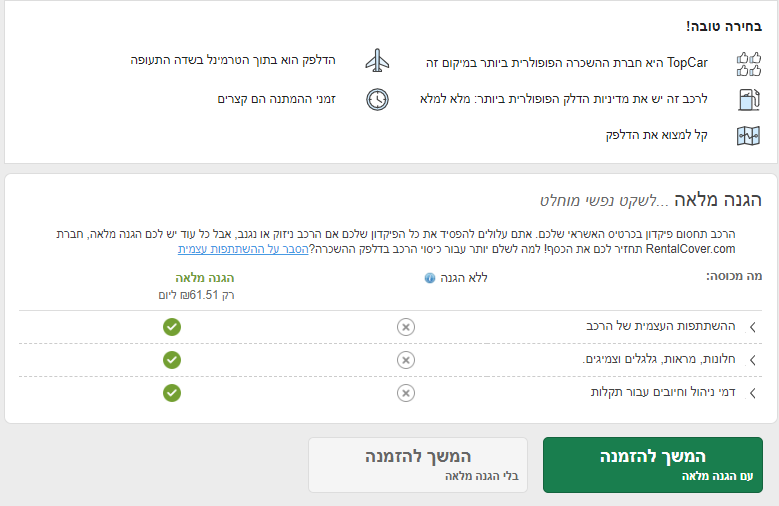 במסך הבא, נראה סיכום של פרטי ההזמנה כולל ציון אם צי הרכבים של חברת ההשכרה נמצא בתוך שדה התעופה או מחוצה לו ( מבחינת שאטל שצריך לקחת).