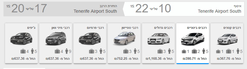לאחר מכן, יש לשים לב לסרגל העליון שמפרט בדיוק מה התאריכים והשעות (לוודא שלא טעיתם) ובנוסף, מציין את סוגי הרכבים לפי כמות אנשים ומזוודות שיכולים להכנס.